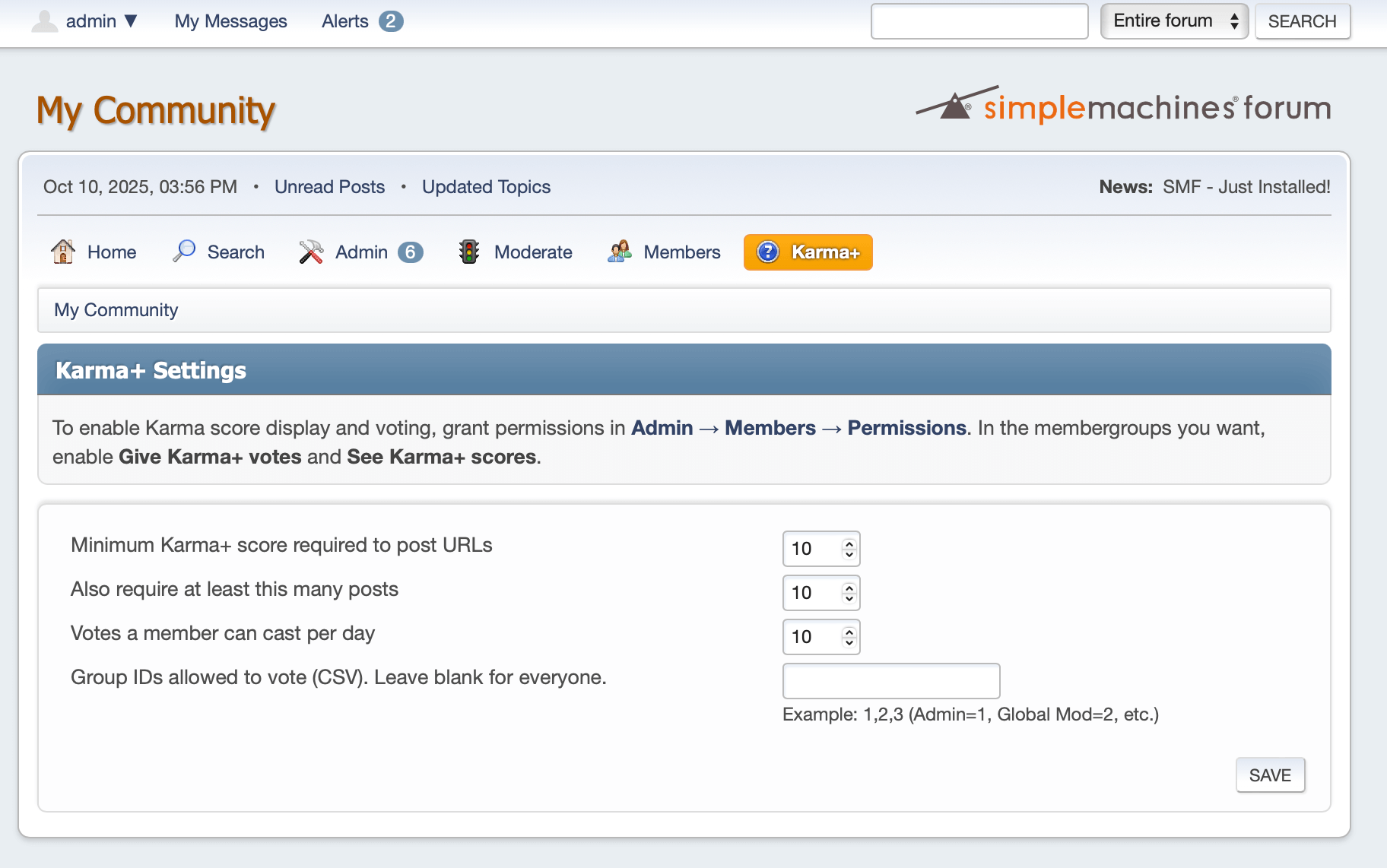 Turn your Simple Machines Forum (SMF 2.1.x) into a modern, community-driven platform with KarmaPlus — a lightweight, hook-based reputation/karma mod that adds upvote/downvote buttons, visible Karma+ scores in profiles and mini-profiles, and an anti-spam URL posting limiter for new or low-reputation members.